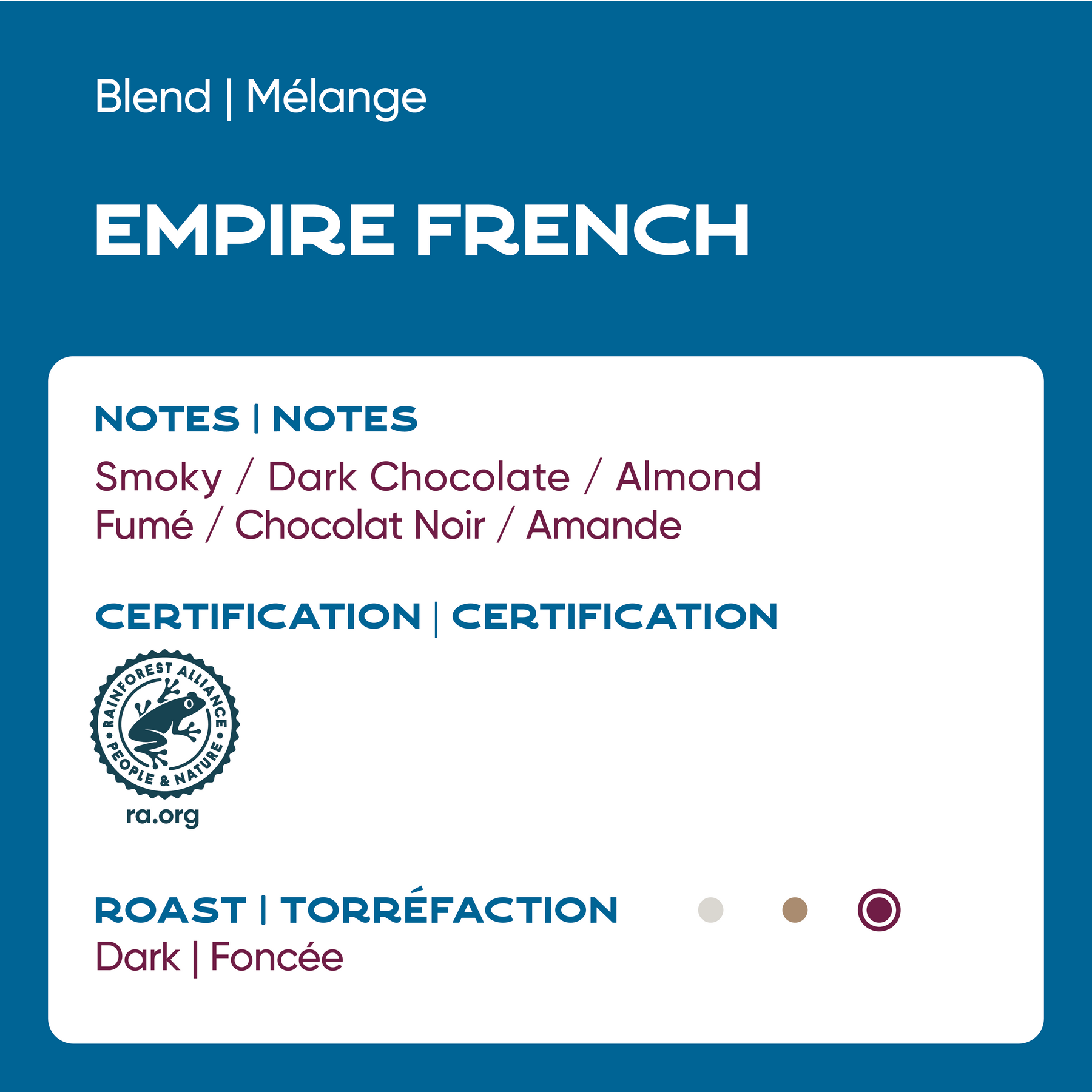 The coffee equivalent of a big, full-bodied Cabernet, Empire is as bold as the famous Corsican empire-builder that inspired the label. While this coffee is what is known in North America as a French roast, it's much darker than a traditional French coffee. The coffee is roasted to the point that the beans reach a deep, dark brown color and aromatic oils coat the surface of the beans. Roasting beyond the second crack to develop this color brings out bittersweet, smoky notes in the beans and mutes the brighter, winy notes. All the coffees used in our Empire blend were selected to contribute to its full body and dark cocoa flavors. These beans are hand-picked from high-altitude Rainforest Alliance Certified farms in Latin America. To highlight the robust character of Empire, we suggest using a French Press as the ideal brew method, though it works well in an auto-drip brewer for larger groups.